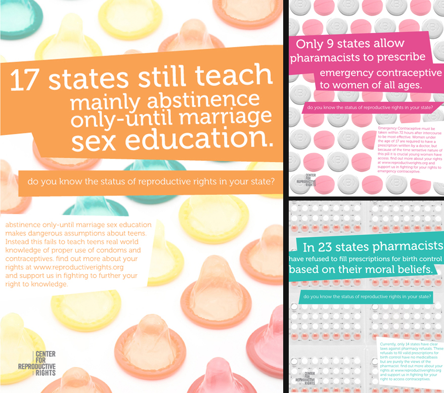 A series of bright eye catching informational ads for The Center for Reproductive Rights.