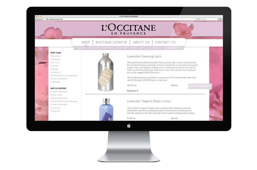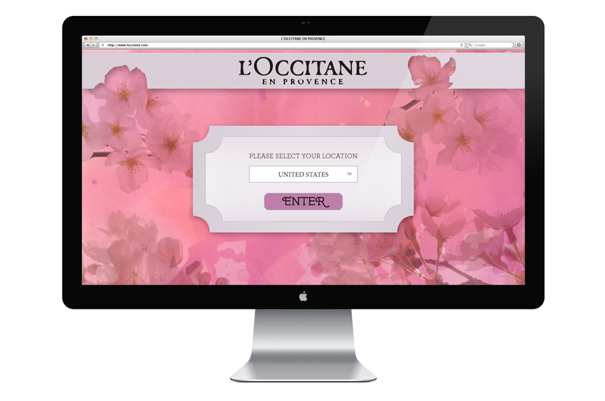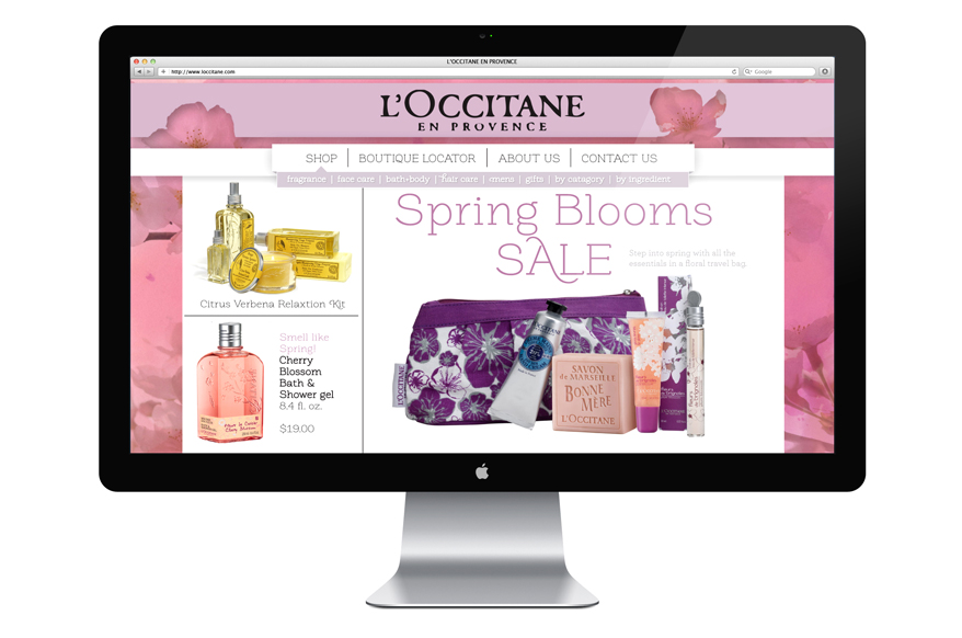 The L'OCCITANE experience was the idea and inspiration behind the colorful spring promotions. The hyper-feminine ads and window display backdrops tie into the floral theme of the sale. The website redesign simplifies the navigation and continues the floral theme.